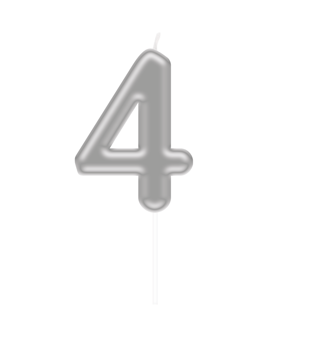 Celebra cada hito con estilo con esta vela número plateado "4". Perfecta para marcar edades, números de aniversario u otras ocasiones especiales. El color plateado brillante hace que la vela destaque en cualquier tarta o cupcake.
