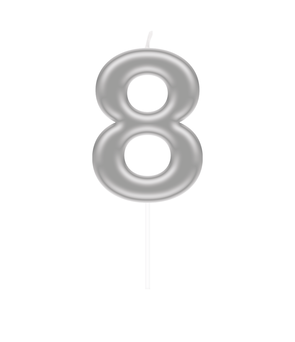 Celebra cualquier hito con estilo con esta vela número "8"plateada. Perfecta para marcar edades, números de aniversario u otras ocasiones especiales. El color plateado brillante hace que la vela destaque en cualquier tarta o cupcake.