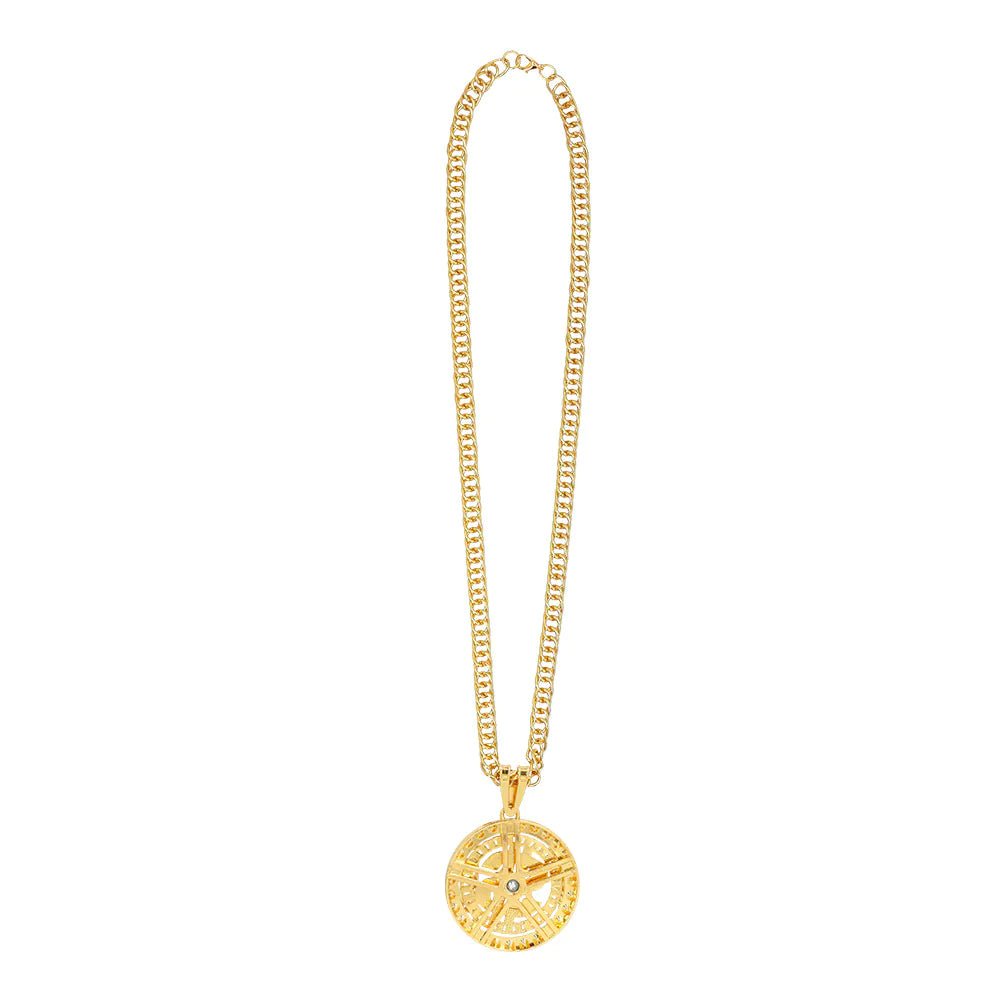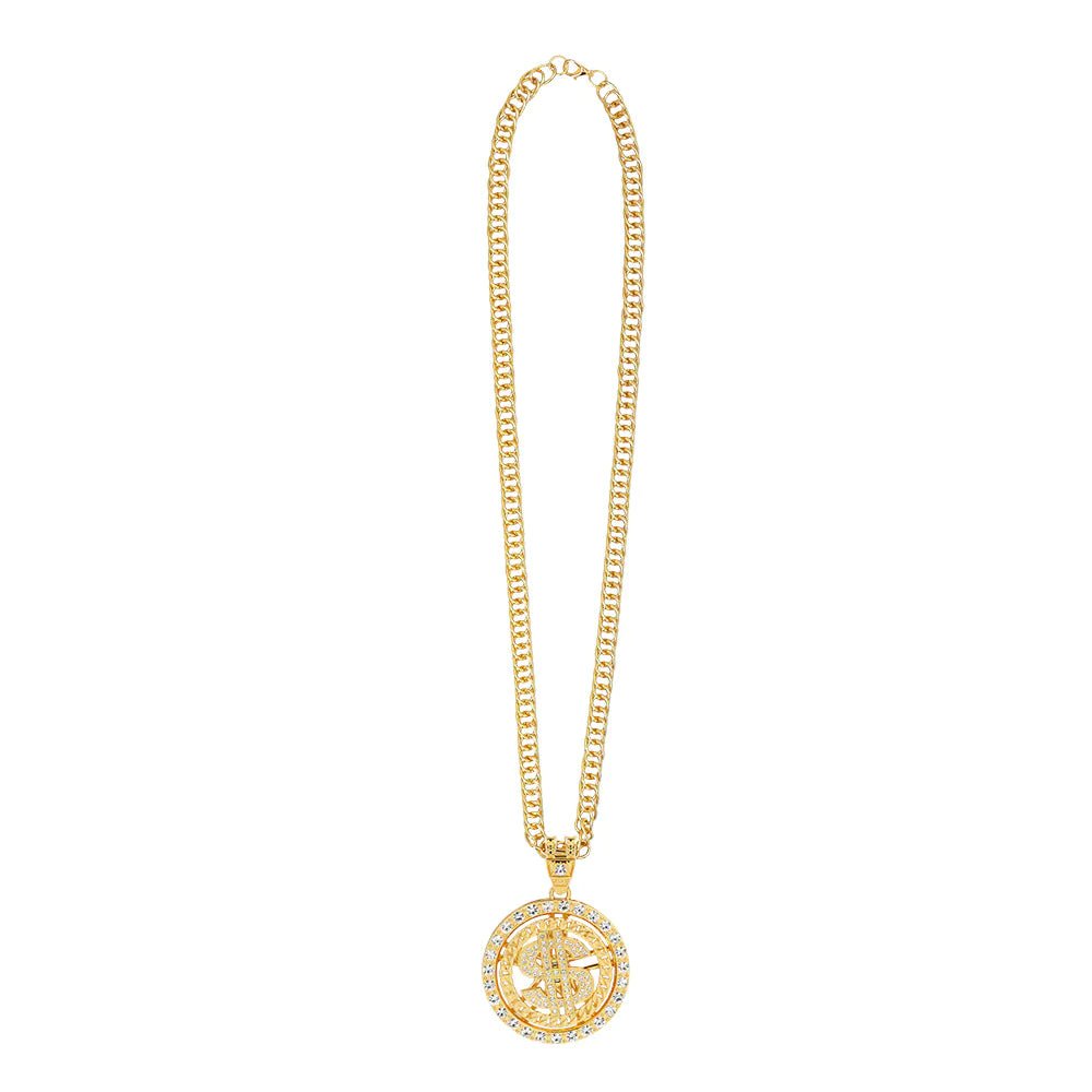 Añade un toque de bling-bling y estilo con este collar dorado con el signo del dólar y diamantes. Este sensacional accesorio para disfraces es la pieza definitiva que completará tu look de disfraz en carnaval, en una fiesta de disfraces o en una fiesta equivocada.