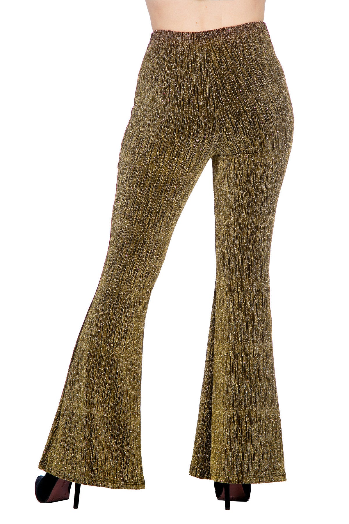 Destaca en las fiestas con estos pantalones acampanados de purpurina dorada. Perfectos para carnavales, fiestas temáticas, noches de baile o cualquier ocasión en la que se desee brillo y glamour.