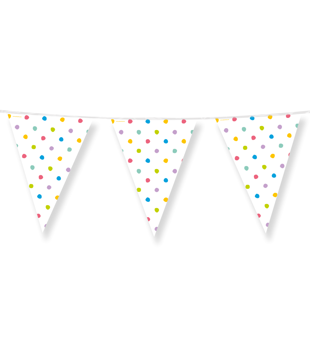 La guirnalda mide 4 metros, es ligera, resistente y fácil de colgar, tanto en interiores como en exteriores. Combina las banderas con los globos, sombreros de papel, palos de cóctel y adornos de mesa a juego de la línea Party Dots para conseguir un aspecto completo y festivo.