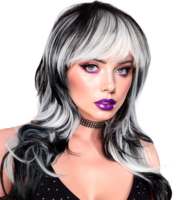 La Peluca Dama Vampiro Negra/Blanca es un llamativo accesorio que confiere al instante un aspecto misterioso y con carácter a un disfraz o traje de fiesta. La combinación de colores blanco y negro en contraste hace que esta peluca sea especialmente adecuada para disfraces de vampiresa, góticos y de otras temáticas.