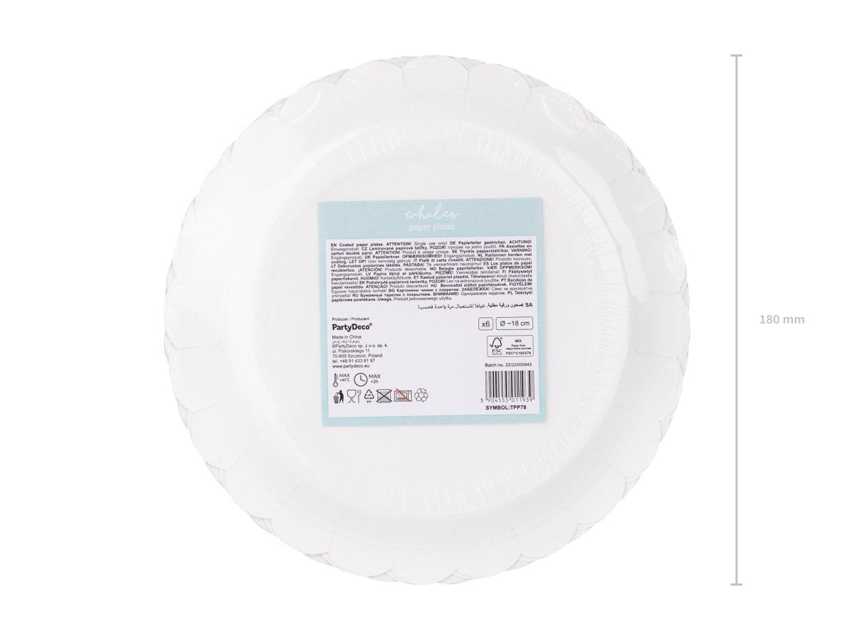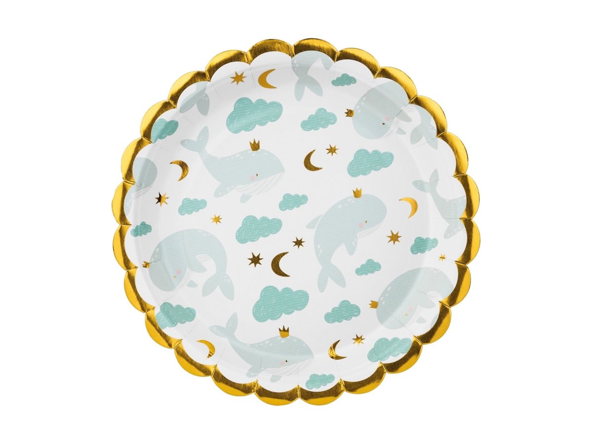 Platos de papel Ballenas, mezcla de colores, diámetro aprox. 18 cm.