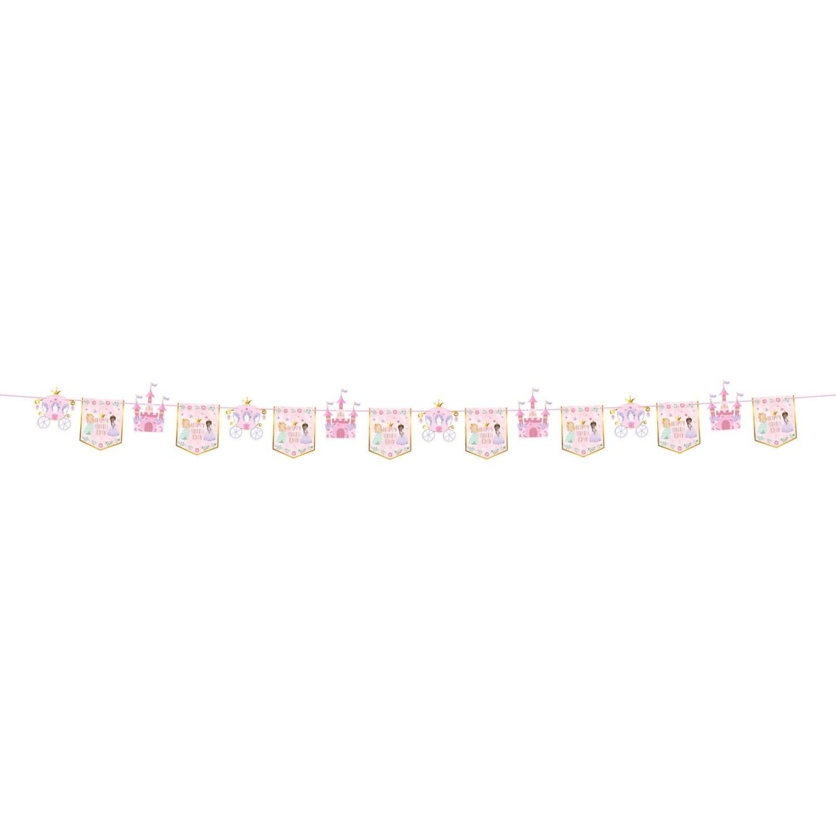 Para fiestas de princesas encantadoras. Línea de bandera - Princesa bonita - 6 metros. Contenido: 1 línea de bandera. Para utilizar, por ejemplo, en las siguientes fiestas/fiestas: Fiesta infantil, Cumpleaños. ¡Será realmente una fiesta para princesas! En esta línea de banderas de 6 metros hay 16 banderas de un tamaño aproximado de 17 x 21 cm. Hay 3 tipos de banderas: una bandera rosa con el texto "FELIZ DÍA DE CUMPLEAÑOS" y dos princesas, una en forma de castillo y otra en forma de carruaje. Todas las banderas tienen un bonito detalle dorado que realmente brilla gracias a la técnica de estampación en caliente utilizada Las banderas están impresas por las dos caras. Se pueden deslizar hacia delante y hacia atrás sobre la cinta rosa. Esta línea de banderas pertenece a la colección Pretty Princess de