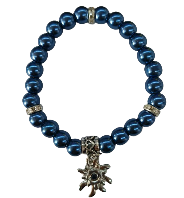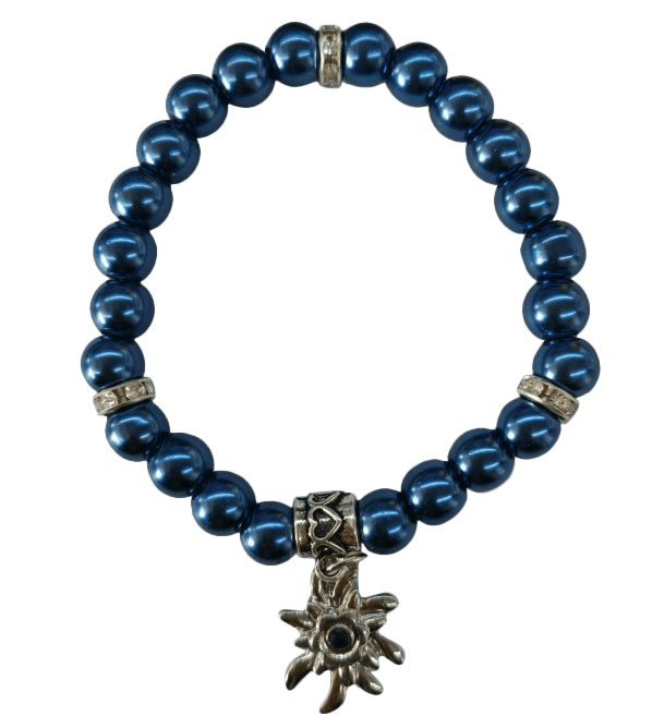 Añade un toque elegante a cualquier atuendo con esta pulsera azul oscuro con perlas y edelweiss. Su elegante diseño hace que la pulsera sea adecuada para llevarla a diario o como regalo especial.