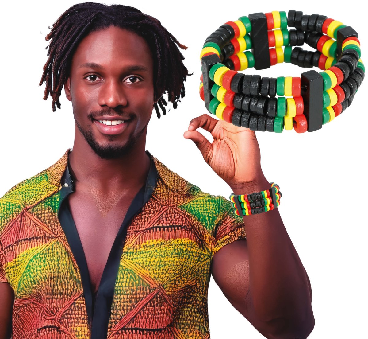 Moderna pulsera de estilo rasta hecha de madera en los característicos colores negro, amarillo y verde. Perfecta para dar a tu atuendo un toque alegre y colorido, o como accesorio para fiestas temáticas y festivales.
