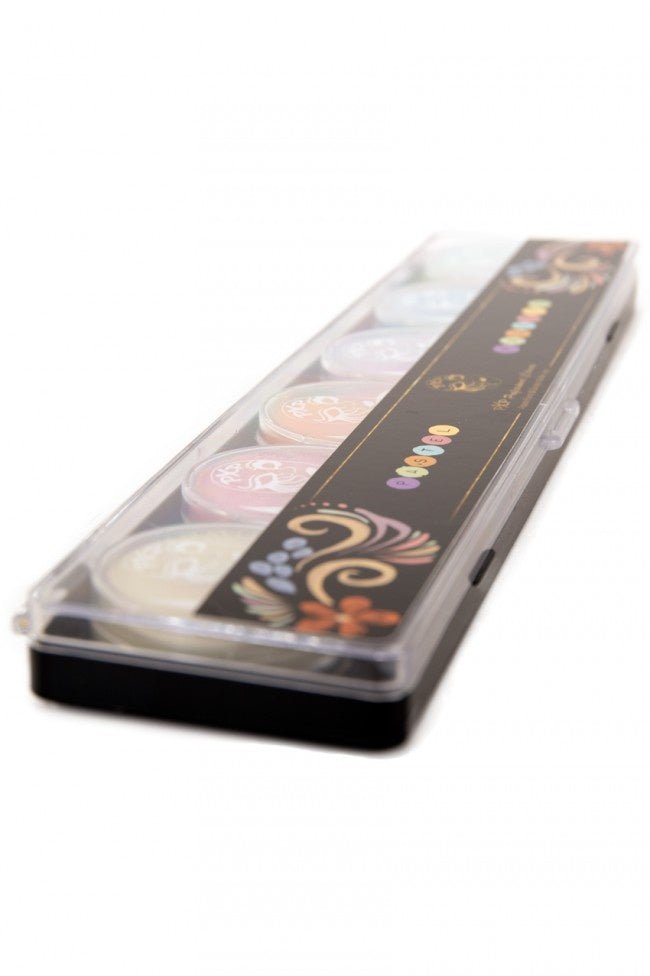 Esta paleta PXP Schmink Pastel 6 contiene seis botes de maquillaje (Amarillo metálico suave, Rosa metálico suave, Lila metálico suave, Azul metálico suave, Verde metálico suave y Naranja melocotón) de 10 gramos cada uno.