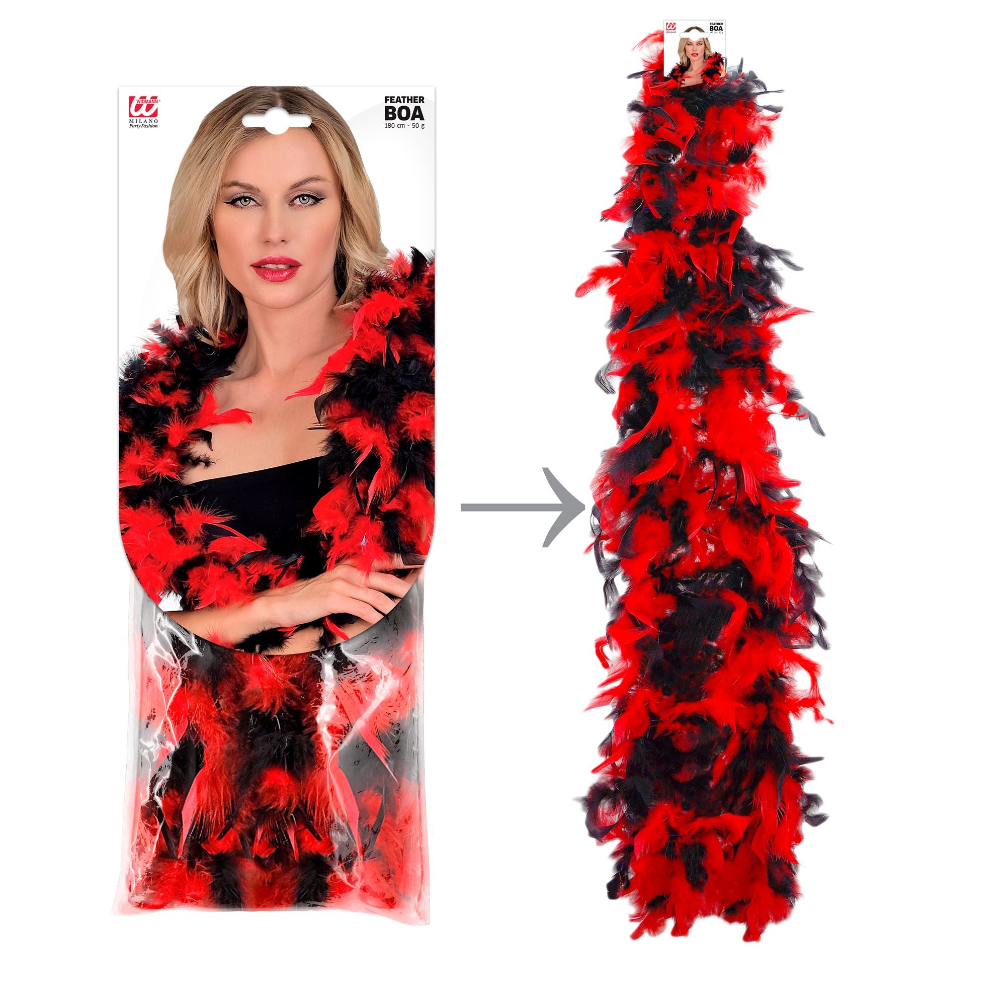 Añade un toque extra a tu atuendo con esta llamativa boa rojo-negro de suaves plumas. Perfecta para fiestas, carnavales o noches temáticas en las que no puede faltar un toque de glamour y dramatismo.