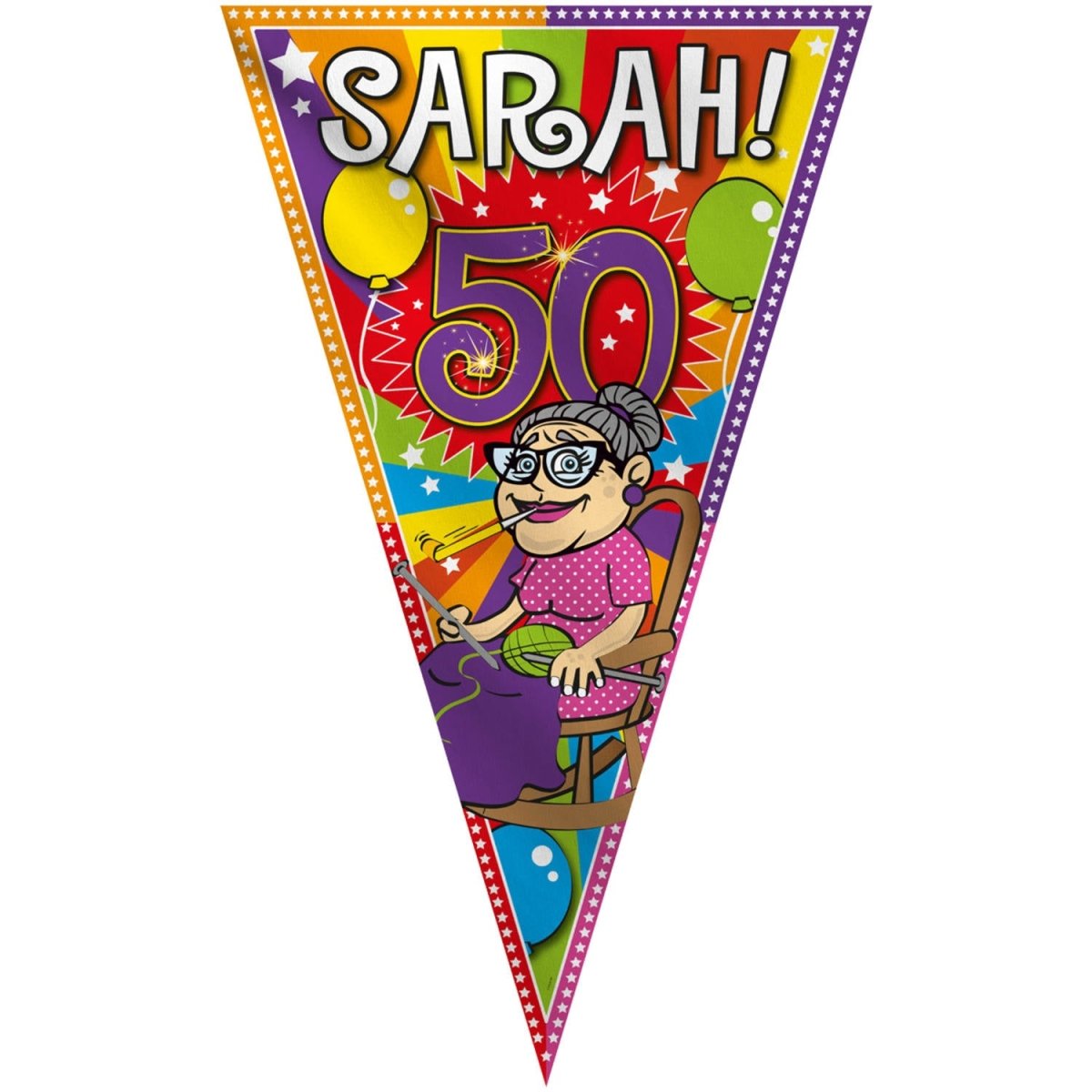 50 Años Sarah Party Mega Bandera 100x150. Contenido: 1 bandera. Color: Multicolor. Para utilizar, por ejemplo, en las siguientes fiestas/fiestas Fiesta temática, Cumpleaños. Dimensiones de este artículo: 100x150 cm. Este artículo está hecho de poliéster.
