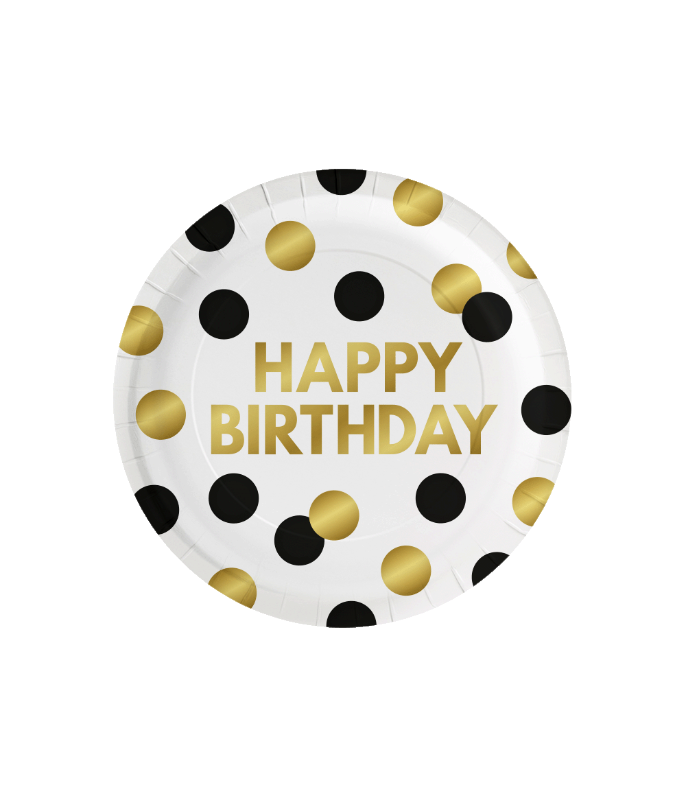 Platos Feliz Cumpleaños Puntos Dorados Negros 23cm 8pcs