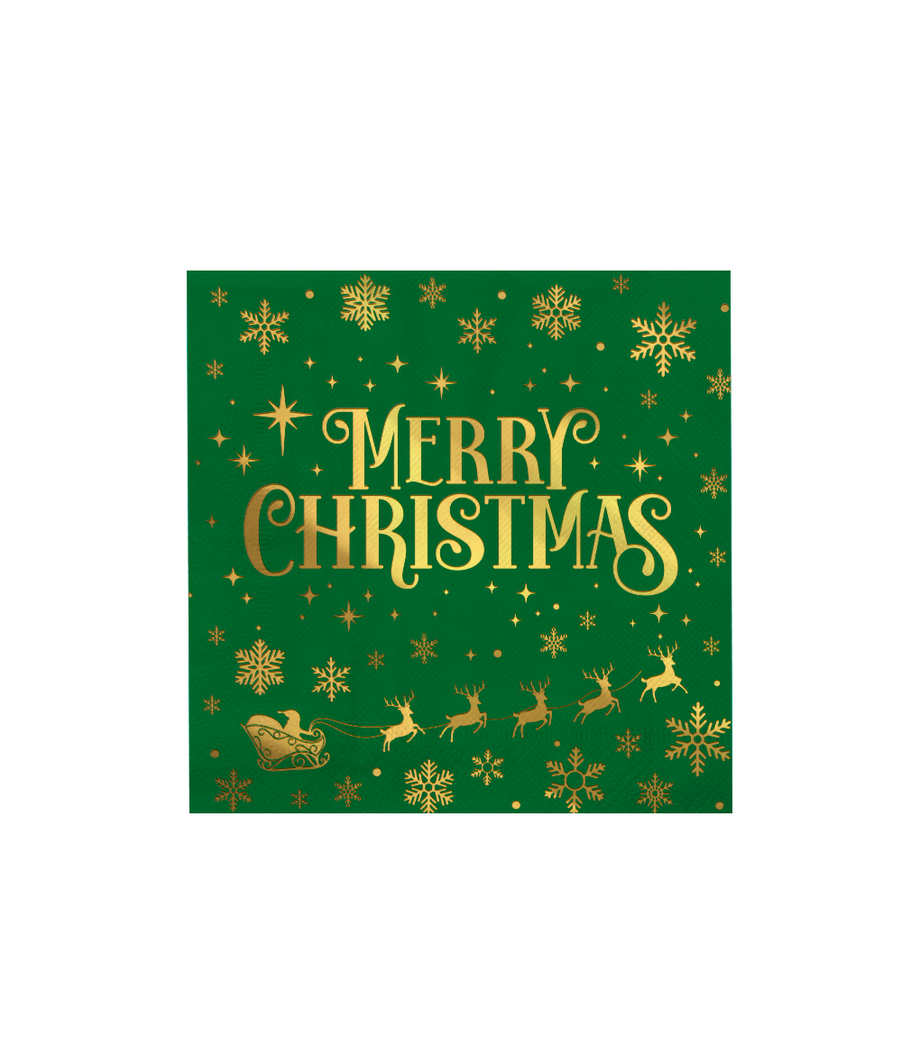 Completa tu mesa navideña con estas servilletas verdes con detalles dorados de Feliz Navidad. Los colores festivos y los elegantes motivos crean al instante un aspecto cálido y acogedor durante las fiestas.