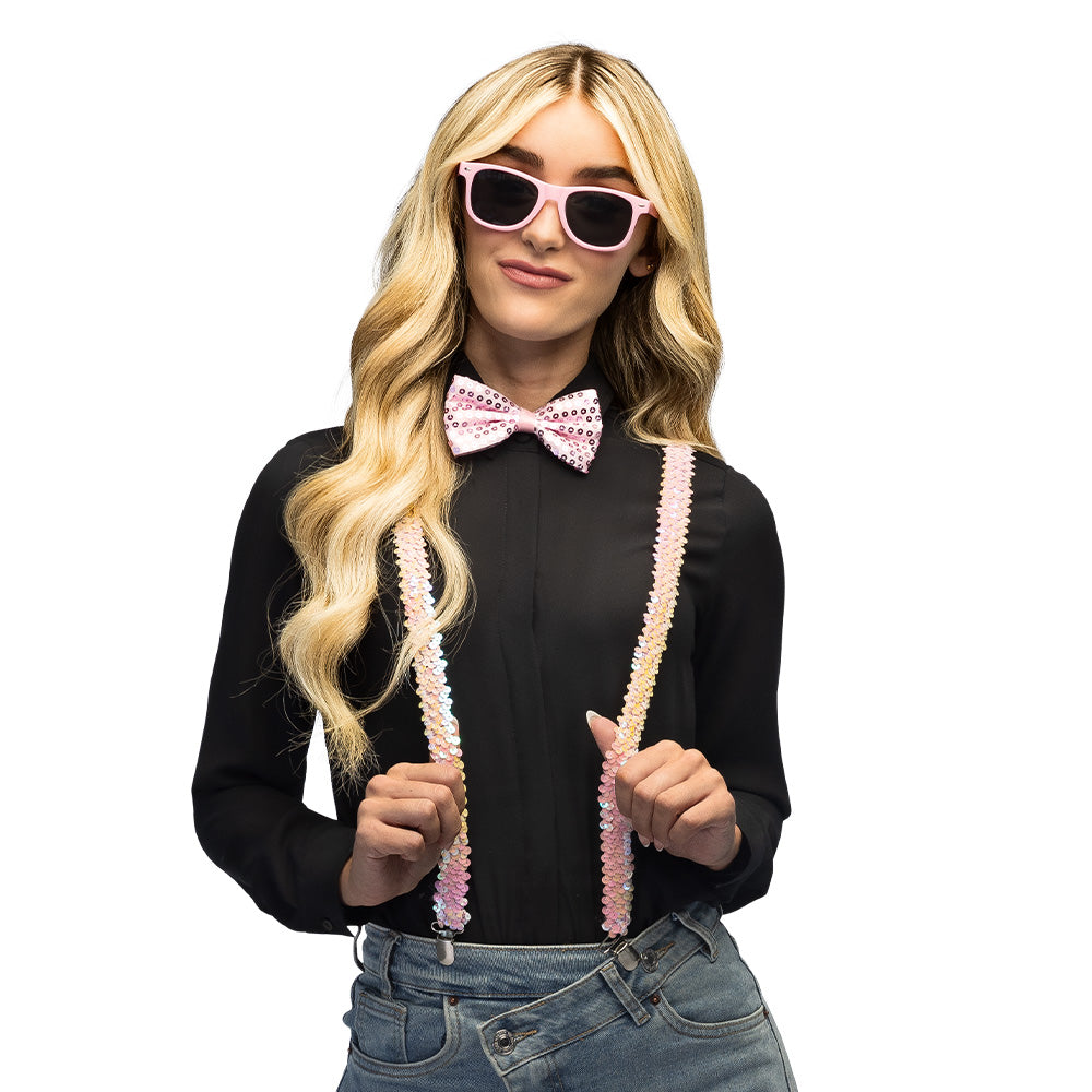 ¡Acapara todas las miradas con este reluciente set de accesorios de fiesta de 3 piezas rosa claro! El set incluye unas brillantes gafas, una pajarita a juego y unos festivos tirantes, todo perfectamente conjuntado. Ideal para fiestas temáticas, carnavales, cumpleaños o cualquier ocasión en la que quieras brillar. Completa tu atuendo y te garantizamos que atraerás todas las miradas!