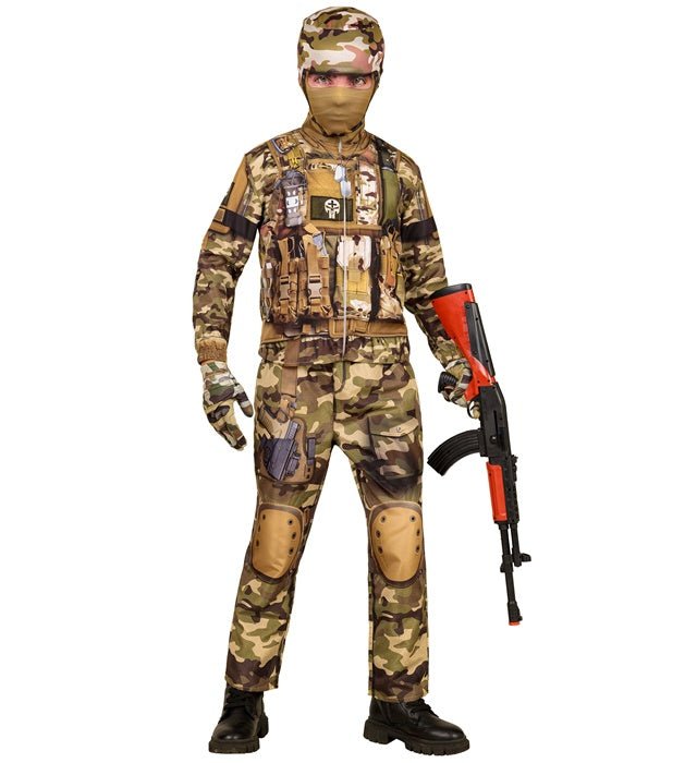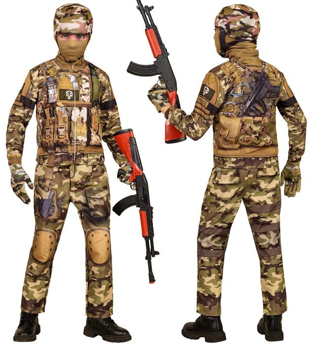 Ve a la guerra con este completo disfraz de soldado. Perfecto para fiestas temáticas, fiestas de disfraces o cosplay militar.
