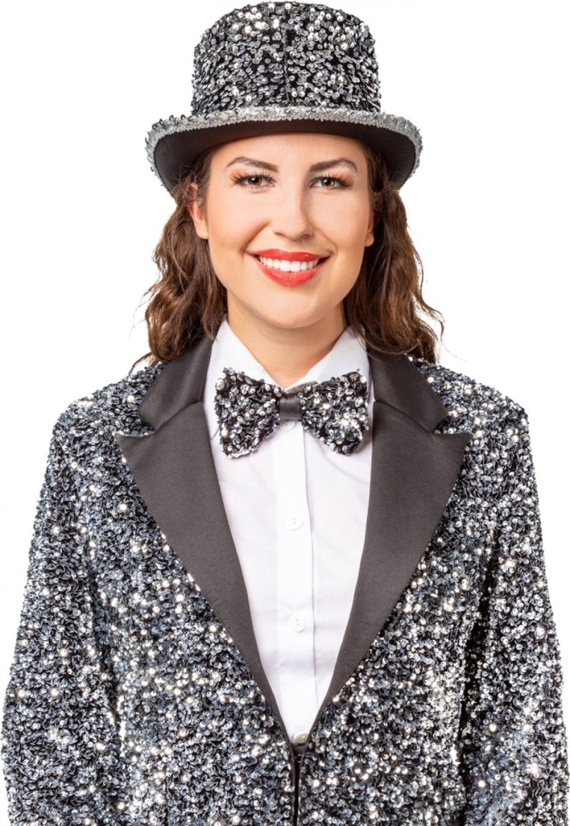 ]Este sombrero de purpurina plateada es un llamativo accesorio perfecto para carnaval y otras ocasiones festivas. Ideal para dar a tu atuendo un aspecto glamuroso y festivo.