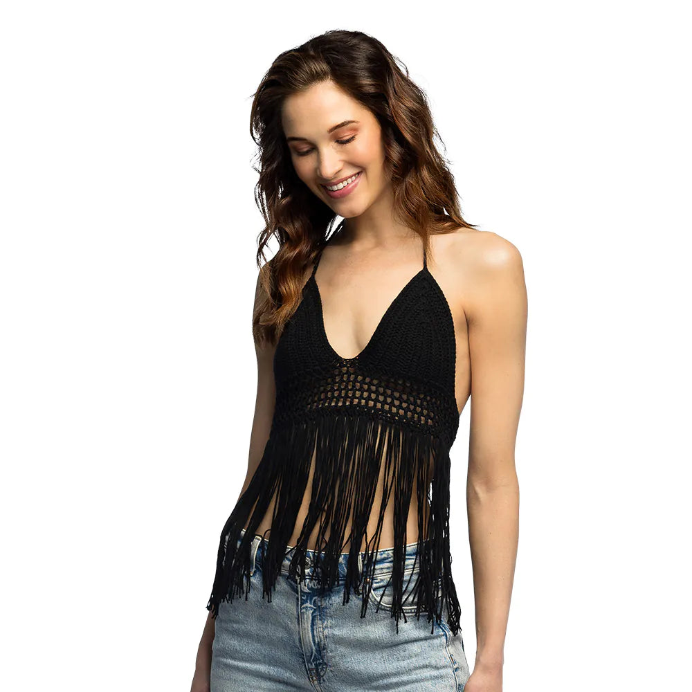 ¡Deja que brille el sol con este bonito top negro de ganchillo en la talla M! El estampado decorativo del centro y los juguetones flecos de la parte inferior dan a este crop top un auténtico aire boho. Perfecto para llamar la atención en festivales, fiestas en la playa o un día soleado en la ciudad.