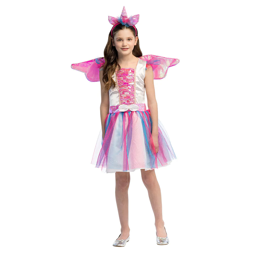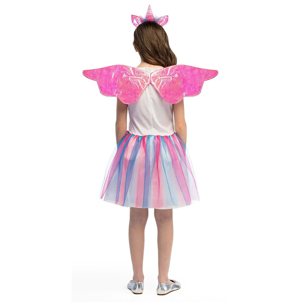 Un disfraz infantil mágico que hará brillar a cualquier niña. Completo con vestido rosa de purpurina, alas y diadema de unicornio a juego, todas las niñas se sentirán como princesas unicornio de un cuento de hadas. El disfraz es perfecto para fiestas infantiles, fiestas de disfraces y carnaval.