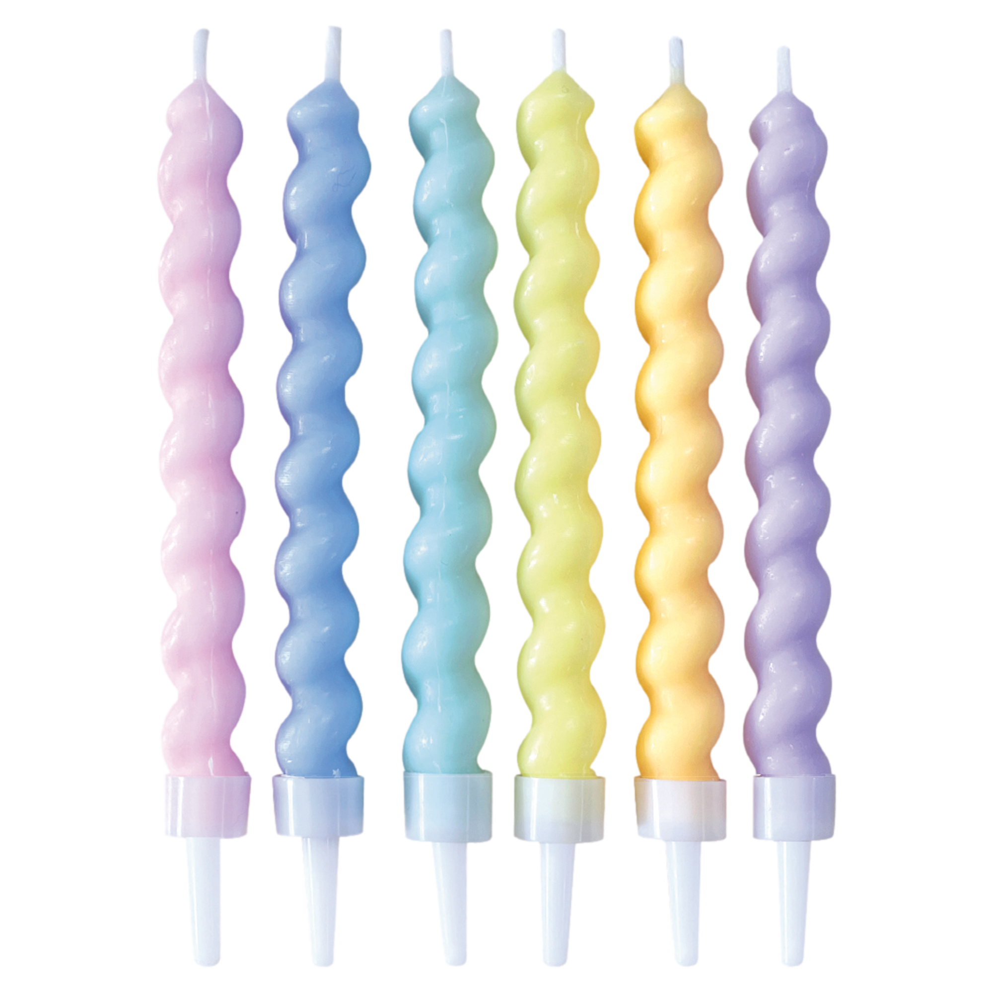 Haz que cualquier fiesta sea muy especial con este juego de seis velas pastel retorcidas de colores. La elegante forma retorcida y los suaves colores pastel aportan un aspecto festivo y elegante a cualquier tarta. Están hechas de cera, lo que permite colocarlas de forma segura sobre la tarta. Perfectas para cumpleaños, aniversarios u otras ocasiones festivas. El paquete contiene 6 velas retorcidas de cera en colores pastel.