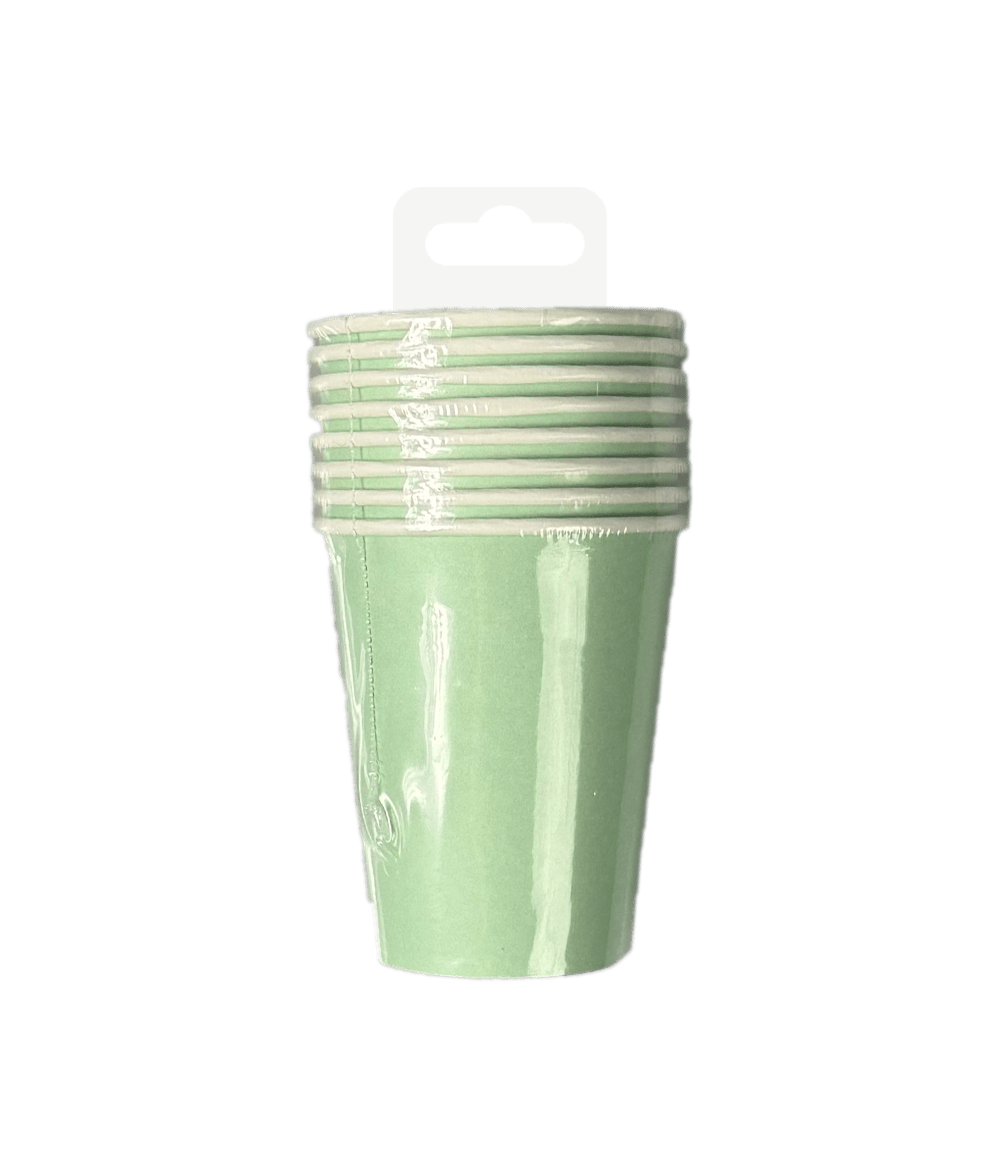 Los Vasos - Verde pastel son los artículos de decoración perfectos en una fiesta cuyo tema sea el color verde pastel. Estas tazas miden 8,5 x 7 cm, van embaladas de 8 en 8 y encajan perfectamente con los demás artículos verde pastel, como el confeti, las servilletas, los platos, los manteles, las cajas de aperitivos y la línea de banderines. Presenta estos artículos juntos para que al cliente le quede claro de inmediato en qué consiste esta colección. Estos vasos son de papel, por lo que son ecológicos