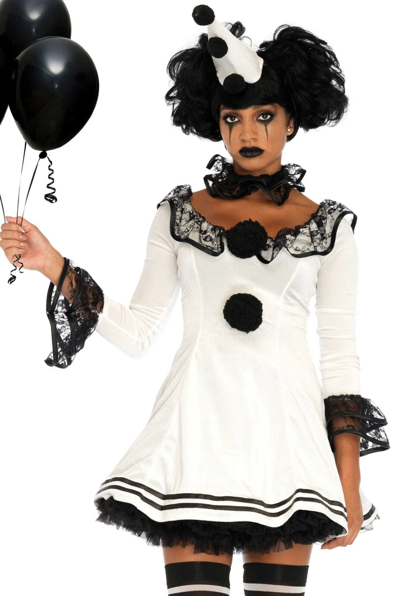 ¡Nos encanta este simpático Payaso Parisino ! El Disfraz de payaso Pierrot de 3 piezas incluye un vestido de terciopelo con detalles de encaje y detalles de pompones, un cuello con volantes y un sombrero a juego con una cinta para el pelo. ¡Perfecto para robar el show en Halloween o en una fiesta de circo! 🎉🤡