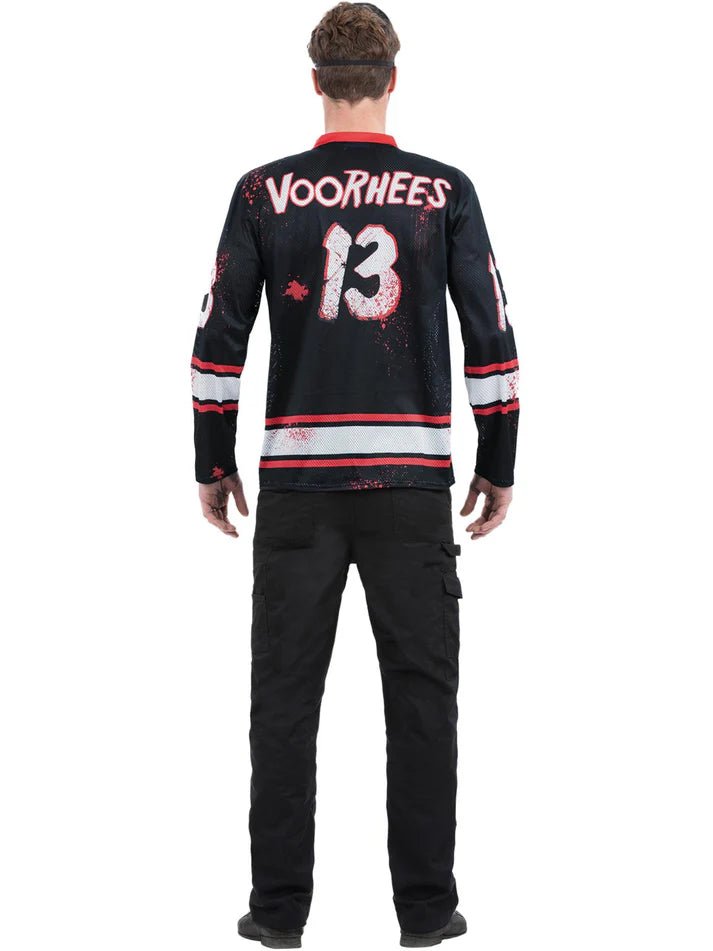 Ponte en la piel de Jason Voorhees con este disfraz de camiseta de hockey. Ideal para combinar con una máscara a juego para un auténtico look de terror en Halloween o fiestas temáticas.
