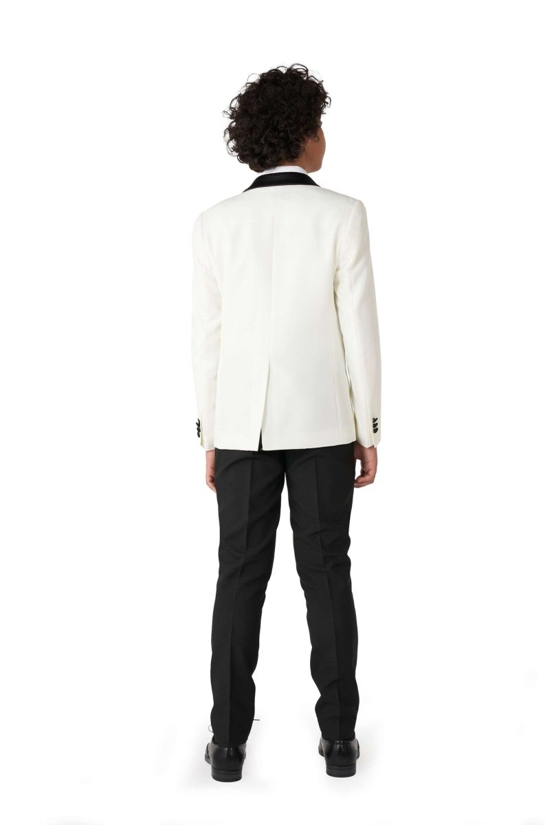 Una chaqueta de esmoquin de color hueso es una de las opciones más elegantes para vestir de etiqueta, tengas la edad que tengas. Combinado con un pantalón de chaqueta negro con doble pliegue y una pajarita, tu hombrecito será el centro de todas las miradas en la próxima fiesta familiar.