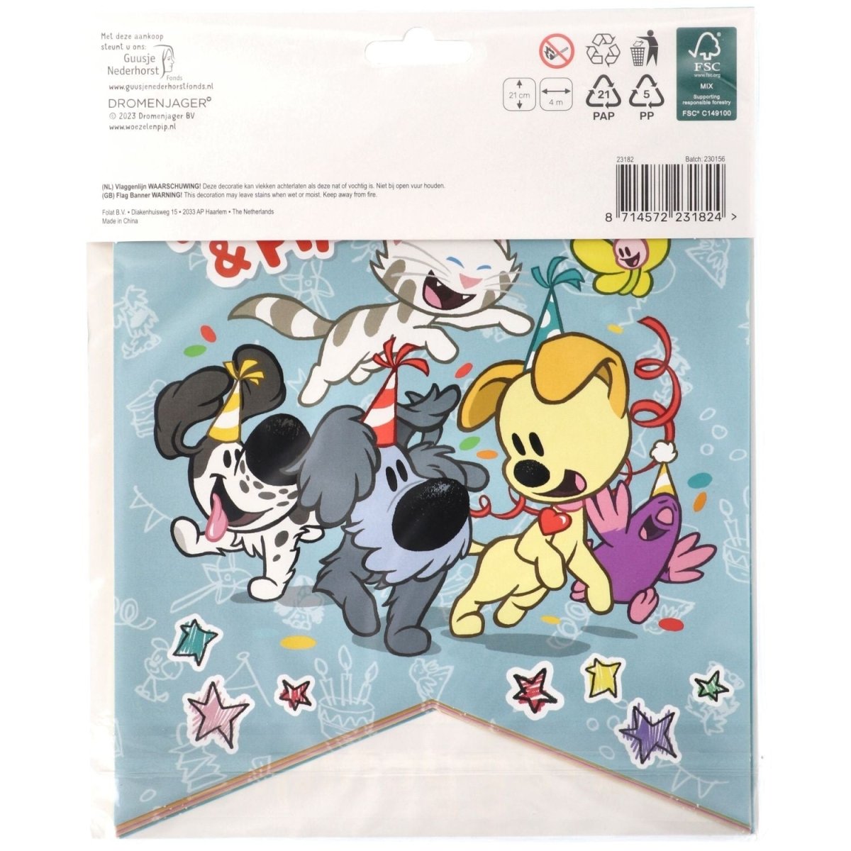 ¡Qué divertida fiesta de amigos! Línea de bandera, Woezel y Pip, 4 metros. Contenido: 1 línea de bandera. Por ejemplo, para utilizar en las siguientes ocasiones de fiesta/fiesta: Cumpleaños, Fiesta infantil. Una línea de banderas alegre y festiva con 8 banderas impresas a doble cara. Las banderas son de papel, la línea es de cinta blanca. Este artículo ar está fabricado con papel FSC.