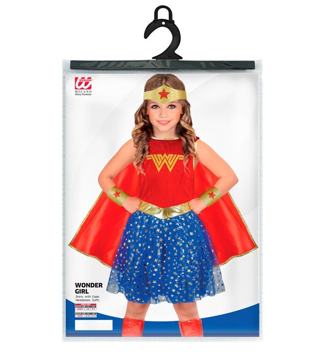 Transfórmate en una heroína con este disfraz de Chica Maravilla en rojo y azul. El conjunto incluye un vestido con capa, puños a juego y un tocado que completa el look. Ideal para fiestas temáticas, fiestas de disfraces o eventos de cosplay. El pack contiene 1 disfraz de Chica Maravilla que incluye vestido con capa, manguitos y tocado.